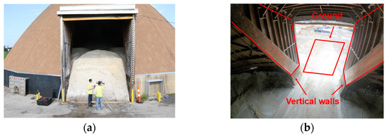 Stockpile volume estimation is quite important for bulk material management. Depending on the type of stockpiles (e.g., aggregate, grain, salt), they could be stored either outdoors or within indoor facilities. Salt, which is quite important for ensuring traffic flow under winter storm conditions, is usually stored within indoor facilities [1]. As shown in Figure 1, barn and dome enclosures are the typical indoor salt stockpile storage facilities. Within the state of Indiana (USA), 60% of the salt storage facilities are domes. In recent years, stockpile volume estimation has been conducted using photogrammetric and LiDAR-based approaches [2,3,4,5,6,7]. Image-based techniques use automatically identified conjugate points in overlapping images for deriving a 3D model covering the area of interest through Structure from Motion (SfM) strategies [8]. These approaches might fail when dealing with datasets in indoor facilities due to unfavorable lighting conditions, as well as the texture-less nature of stockpiles.