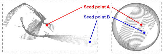 A LiDAR scan and two sample seed points; points are represented by Cartesian (left) and normalized polar (right) coordinates.