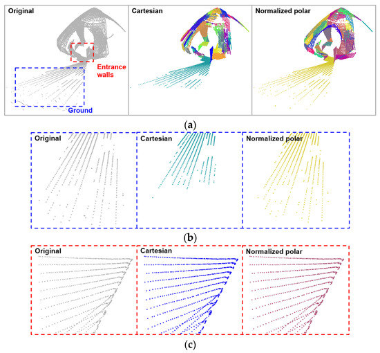 Planar feature segmentation results: (a) comparison of segmentation results based on Cartesian and normalized polar coordinates of the original point cloud (ground and entrance walls are highlighted in blue and red dotted boxes, respectively), (b) zoom-in window of the ground feature, and (c) zoom-in window of the entrance wall feature.