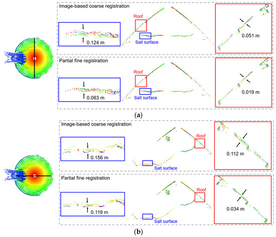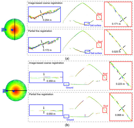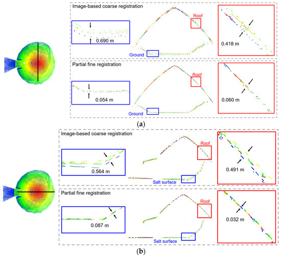 Extracted vertical profiles (width: 0.2 m) from the salt surface of the Frankfort dataset after the partial fine registration using the roof feature, partial fine registration using the ground/wall features, and full fine registration using the roof/ground/wall features (the arrows indicate the direction of the measured distance): (a) profile orthogonal to the entrance walls and (b) profile parallel to the entrance walls.