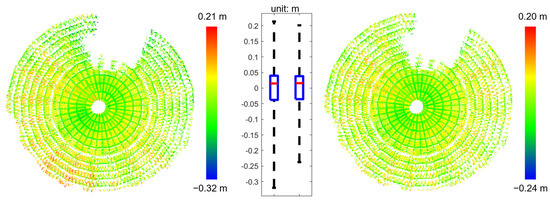 Heat maps and box plots representing the normal distance between the roof feature points and fitted quadratic surface for the West Lafayette dataset before (left) and after (right) partial fine registration.