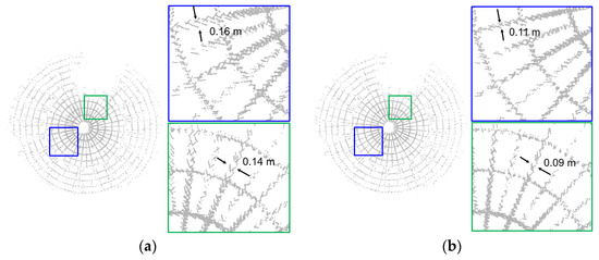 Extracted vertical profiles (width: 0.2 m) along the salt surface of the West Lafayette dataset before/after the full fine registration (the arrows indicate the direction of the measured distance): (a) profile orthogonal to the entrance walls and (b) profile parallel to the entrance walls.