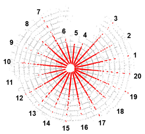 Finally, in Step 4, a feature matching procedure is conducted to identify conjugate stringers among different scans. Based on the proposed extraction strategy, derived stringers and their 2D projection intersect at a single point (i.e., roof apex). Thus, the azimuth of detected stringers relative to a reference direction following the coarse and partial fine registration of the individual scans can be used as the matching criterion (as shown in Figure 19a). Due to the sequential nature of the image-based coarse registration (which is the only available information for establishing the rotation around the dome axis), the azimuth evaluation for the stringers in the different scans will exhibit an error propagation that will increase as we move away from the first, reference scan. In other words, the azimuth-based stringer matching will only be reliable when considering two successive scans. To avoid the impact of error propagation when matching stringers in non-successive scans, we use matched stringers in successive scans to redefine the stringers’ azimuth relative to a new reference direction for the last considered scan (this concept is illustrated in Figure 19b). One should note that the stringer extraction and matching is conducted in 2D, which can be traced backward to the respective ones in 3D. Figure 20 shows established conjugate stringers for the West Lafayette dataset. A summary of the stringer extraction steps is provided in Figure 21 (steps 1–4 in Figure 14).