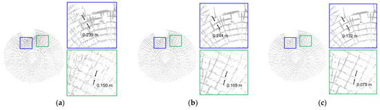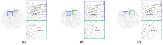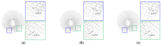 Extracted edge points from the scans in the West Lafayette dataset before/after the full fine registration: (a) partial fine registered edge points, (b) full fine registered edge points using roof/stringer features, and (c) full fine registered edge points using the roof/stringer/ground/wall features.