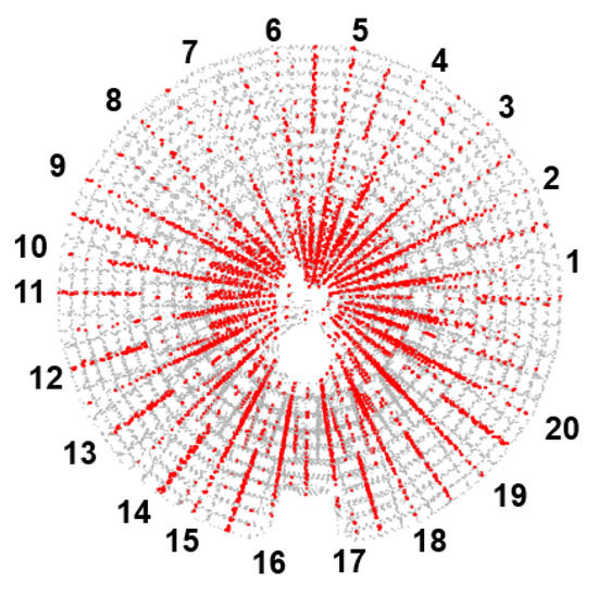 In Step 2, we aim at clustering edge points that belong to a distinct roof stringer. First, edge points are projected to a 2D space orthogonal to the defined dome axis by the partial fine registration procedure, as shown in Figure 17a. A 2D Hough transform is then used to detect 2D lines [34]. In order to detect roof stringers on both sides of the apex, which might be collinear, as different 2D lines, the range of the angular line parameter in Hough space is defined as [0°, 360°). Moreover, since we are only looking for linear features that pass through the apex, we only consider detected lines with zero normal distance from the origin of the dome coordinate system. A sample line detection result is shown in Figure 17b. As can be seen in this figure, detected lines include correctly extracted stringers, partially correct stringers due to some outlier points along the stringer, and fully erroneous stringers that do not pass through the roof apex (those could be erroneously detected owing to the cell size of the Hough space accumulator array). Sample stringer detection outliers are shown in Figure 17c.