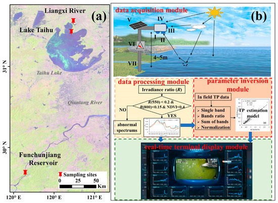 Therefore, developing real-time, high-frequency, continuous and reliable TP monitoring equipment that operates in complex weather conditions is the primary challenge to be solved. In such conditions, an automatic and real-time ground-based hyperspectral proximal sensing system (GHPSs) with high temporal and spectral resolution was developed for water quality monitoring under different weather conditions. In general, the design concept of the GHPSs is that based on 4G (or 5G) online transmission. The terminal computer (or mobile phone) displays the TP dataset, which was calculated from the pre-developed TP estimation model and real-time spectrum gathered from a fixed high-frequency hyperspectral imager that can operate during complex weather conditions. Among the requirements, obtaining accurate hyperspectral irradiance ratio data is the foundation, and developing an accurate and robust TP estimation model is integral. Real-time and high-frequency TP data provides decision support for scientific and effective water environment management and emergency warning.