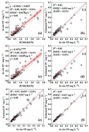 The dataset containing 252 field samples with a range of 0.04 mg·L−1 to 0.62 mg·L−1, and a mean value of 0.11 ± 0.08 mg·L−1 was used to develop the TP estimation model. The developed models were evaluated by the independent analysis of 125 pairs of matching datasets with a TP mean value of 0.11 ± 0.08 mg·L−1.