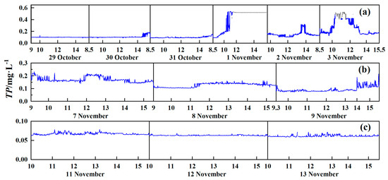 Subsequently, TP decreased significantly from 7 to 9 November (R2 = 0.57, p < 0.01) with mean values of 0.17 ± 0.02 mg·L−1, 0.13 ± 0.02 mg·L−1 and 0.091 ± 0.02 mg·L−1 in LR (Figure 3b), implying that the nutrient load of LR decreased day by day, consistently with laboratory analysis. Furthermore, it should be noted that two short-term rapid rise events for TP occurred: from 0.16 mg·L−1 at 11:48 to 0.22 mg·L−1 at 12:03 on 7 November, or an increase of 37.5%, as well as an increase from 0.08 mg·L−1 at 13:34 to 0.19 mg·L−1 at 14:13 on 9 November, or an increase of 137.5%, indicating that the water body had experienced two pollution events recorded by the GHPSs.