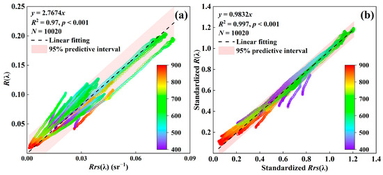 Linear regression between Rrs(λ) and R(λ) from 400 to 900 nm before (a) and after (b).