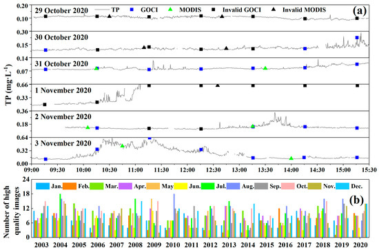 Second, using the GHPSs for real-time, high-frequency and continuous TP observation was conducive to tracking complete variation, and validating and supplementing the dataset collected by traditional monitoring methods. Under the superimposed influence of anthropogenic activities and extreme weather, the response of the TP loads in rivers and lakes to precipitation, plume and wind waves varied significantly with time on a daily scale [28,61]. Whereas, low-frequency manual sampling and satellite remote sensing with a fixed revisit, limited the operation time, and possible cloud obscuration resulted in data gaps for TP (TP can only be recorded during cloudless observation times), which might distort the pattern of TP [62]. Figure 5a displays the time and cloud conditions of the Moderate Resolution Imaging Spectroradiometer (MODIS, square) and Geostationary Ocean Color Imager (GOCI, triangle) crossing LT from 29 October to 3 November 2020. The green and blue colors represent cloudless while the black represents the cloud covering LT. The effective cloudless images of MODIS and GOCI were less than 50% during the observation period (Figure 5a). Moreover, Figure 5b shows the distribution of the monthly cloudless MODIS image covering LT during 2003–2020. About 70.8% of the months had less than 10 effective images and 96.8% of the months had less than 15 effective images. Therefore, the lack of enormous image data caused by cloud and a fixed revisit time was an important reason that hinders the continuous recording of the water environment by satellites. Although the UAVs performed proximal sensing to reduce the impact of aerosols and cloud, the limited hover time still limited its continuous TP observation. In contrast, the applicability to complex weather, proximal sensing avoided the effect of cloud, as well as an uninterruptible power supply, provided the possibility for the GHPSs recording high-frequency observation of total phosphorus, further created conditions for multi-temporal satellite data verification and supplements. In Figure 5a, the minute scale TP dataset derived from GHPSs supplemented the lack of satellite data and completely depicted an exponential increase and two complete single peak variations for TP during 1–3 November.