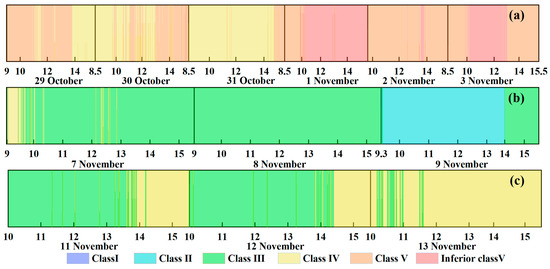 Time series of water body types of Lake Taihu (a), Liangxi River (b) and Fuchunjiang Reservoir (c) based on total phosphorus concentration assessment from 9:00 to 15:30 during 29 October to 13 November 2020.