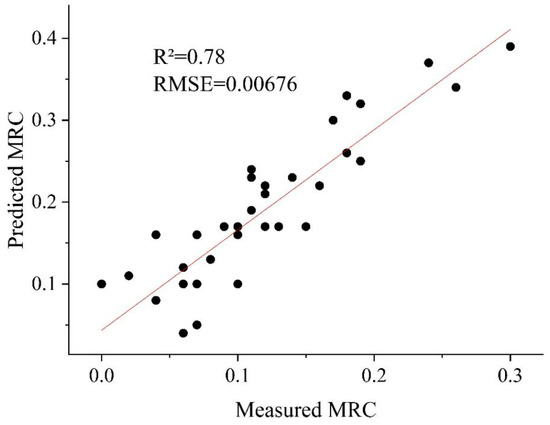 The MRC on 17 May 2021 was estimated from the predicted NDTI, as shown in Figure 4. Since the coordinates of the sampling point obtained from the image and the actual sampling point deviate, a slight offset may be present in the position of the sampling point after the image coordinates are imported. To accurately obtain the field MRC, the MRC was extracted from the estimated average of a 3 × 3−pixel window centered on the sampling point [49]. Then, the fit analysis was performed with the MRC of the actual image extracted on 12 June 2021, and the scatter plot is shown in Figure 5 with an R2 of 0.78 and RMSE of 0.00676.