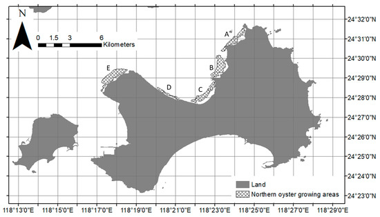 Important oyster-growing areas (A–E) in northern Kinmen.