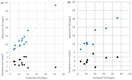 Scatter plots of observed and predicted TSS concentrations for (a) calibration and (b) validation (1:1 line provided).