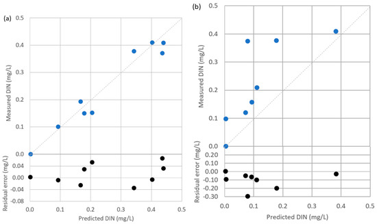 Scatter plots of observed and predicted DIN concentrations for (a) calibration and (b) validation (1:1 line provided).