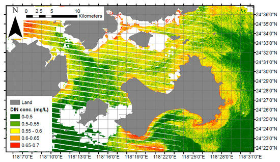 Utilizing the derived statistical models, Figure 7 and Figure 8 provide examples of TSS and DIN concentration distributions, respectively, based on Landsat-7 imagery of 8/10/2018. In Figure 7 and Figure 8, white-out masks indicate the effect of the failed Landsat-7 scan line corrector (SLC), reclaimed land, cloud cover, or cloud shadow [32]. Pollutant plumes can be distinguished around the island in Figure 7 and Figure 8, with one TSS plume particularly distinguishable in the north of the island (at approximately 24°30′N, 118°21′E). It was possibly caused by dredging activities, but the sediment appears to redeposit quickly so it did not affect water quality at the shore. Because no DIN plume is found in the same area, it can be concluded that the bottom material does not contain a lot of nutrients. Figure 7 and Figure 8 also show great variation at different parts of the island’s shore, which is a good demonstration of why remote sensing techniques were chosen by many studies similar to the present one.