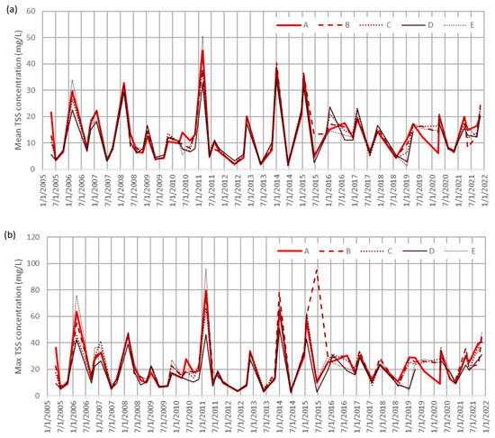 Seasonal variation of (a) mean and (b) maximum TSS concentration in the five oyster-growing areas (A–E in Figure 2).