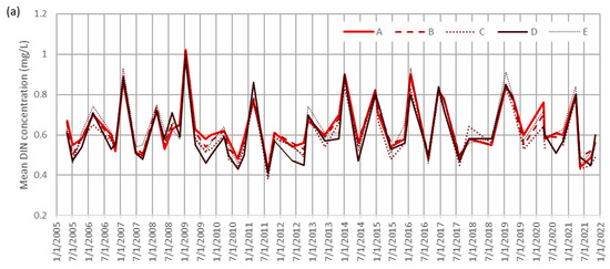 Similarly, DIN also exhibits a steady trend for long-term concentration with significant short-term variations. Taking into account the rapid development in all coastal cities in China, Figure 10 implies that the semi-enclosed bay in northern Kinmen is hydrodynamically isolated from the major cities to a certain degree [5,38], and the land reclamation activity probably did not significantly alter the circulation of nutrients in the bay.