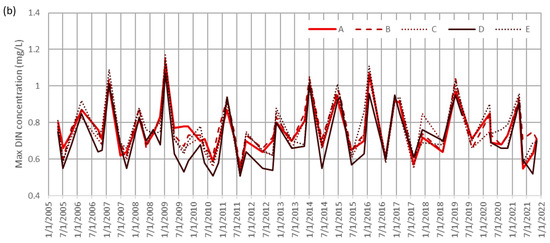 Seasonal variation of (a) mean and (b) maximum DIN concentration in the five oyster-growing areas (A–E in Figure 2).