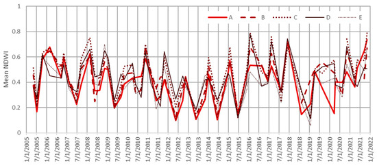 Seasonal variation of NDWI in the five monitoring areas (A–E in Figure 9).