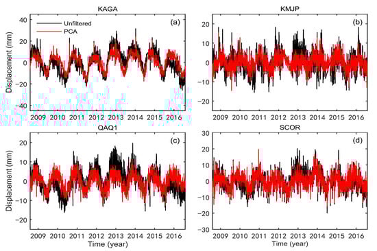 - Dong, D.; Fang, P.; Bock, Y.; Webb, F.; Prawirodirdjo, L.; Kedar, S.; Jamason, P. Spatiotemporal filtering using principal component analysis and Karhunen-Loeve expansion approaches for regional GPS network analysis. J. Geophys. Res. Solid Earth 2006, 111, B03405. [Google Scholar] [CrossRef]