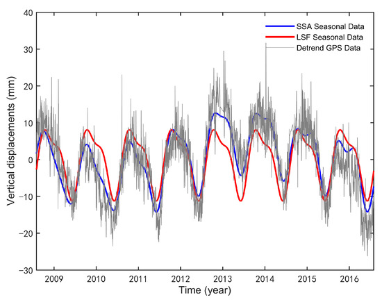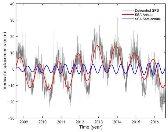 - Chen, Q.; Van Dam, T.; Sneeuw, N.; Collilieux, X.; Weigelt, M.; Rebischung, P. Singular spectrum analysis for modeling seasonal signals from GPS time series. J. Geodyn. 2013, 72, 25–35. [Google Scholar] [CrossRef]