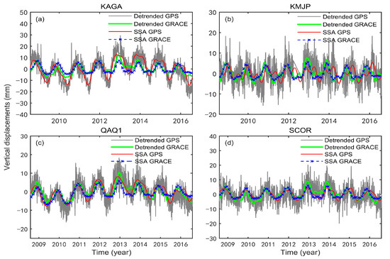 - Van Dam, T.; Wahr, J.; Lavallée, D. A comparison of annual vertical crustal displacements from GPS and Gravity Recovery and Climate Experiment (GRACE) over Europe. J. Geophys. Res. Solid Earth 2007, 112, B03404. [Google Scholar] [CrossRef]