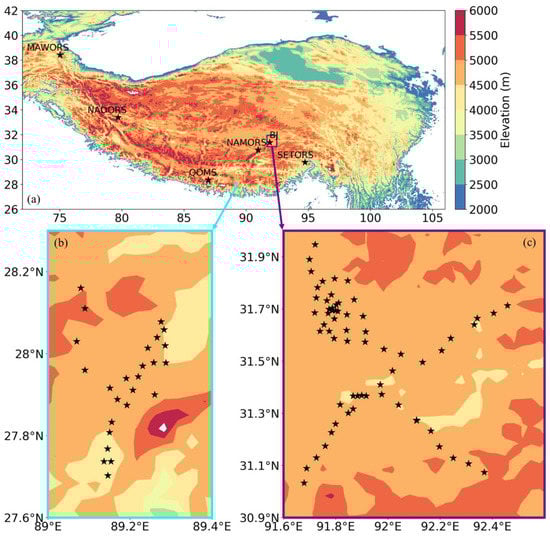 Distribution of field observation stations: (a) TP, (b) Pali, and (c) Naqu. The contour color represents different elevations. Pentagrams represent the station locations.