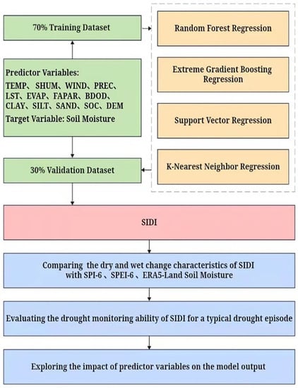Therefore, the objectives of this study are to (1) compare daily integrated drought indices developed by the four ML methods, namely, random forest regression (RFR), k-nearest neighbor regression (KNNR), support vector regression (SVR), and extreme gradient boosting regression (XGBR), based on multisource remote sensing and reanalysis data with the in situ soil moisture and obtain the optimal drought index as the new standardized integrated drought index (SIDI); (2) evaluate the SIDI performance in dry and wet changes against SPI-6, SPEI-6, and European Centre for Medium-Range Weather Forecasts Reanalysis 5 Land (ERA5-Land) soil moisture; and (3) assess the spatiotemporal applicability of SIDI for a typical drought event. The SIDI is expected to monitor plateau droughts with more detail and accuracy for agricultural water resource management.