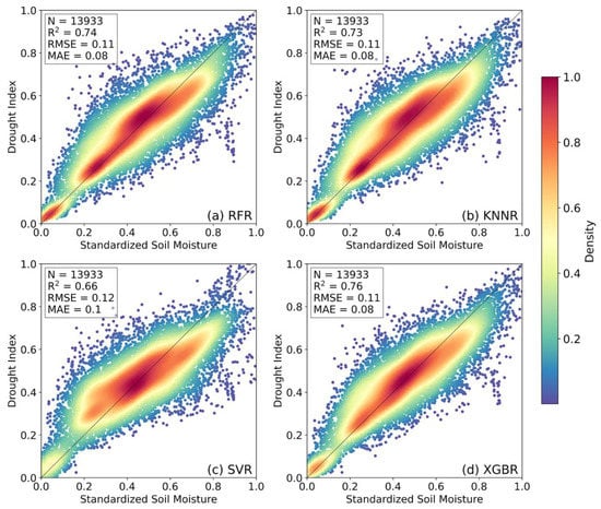 Comparisons of drought indices using four machine learning models with the in situ soil moisture in the training process: (a) RFR, (b) KNNR, (c) SVR, and (d) XGBR. Colors represent data density: the redder the color, the larger the data density is.