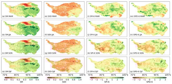 Comparisons of spatial and seasonal distributions of SIDI (e–h) against ERA5-Land SM at 7–28 cm ((a–d), units: m3/m3), SPI-6 (i–l), and SPEI-6 (m–p) in 2012. Colors represent drought degree: the redder the color, the stronger the drought degree is.