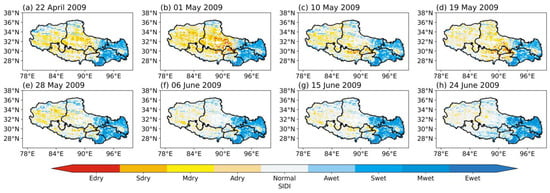 The drought monitoring ability of the SIDI was evaluated for a typical drought event. This event occurred in the Xizang Autonomous Region in May and June of 2009 [,]. SIDI classifications are divided into 9 levels using the percentile threshold method (Table 2) []. Figure 6 illustrates the spatial evolution characteristics of the drought process captured by the SIDI at an interval of nine days from 22 April to 1 July 2009. As shown in Figure 6a,b, an abnormal drought occurred over most regions of Xizang on 22 April, and then the drought intensity rapidly increased. In particular, the central part of Xizang exhibited extreme drought. Subsequently, the drought eased, whether in drought range or intensity, to a large extent on 10 May (Figure 6c). The drought area constantly expanded from the northwestern to southeastern regions of Xizang, with a higher drought magnitude on 19 May (Figure 6d). Thereafter, the drought continued to weaken (Figure 6e–h).
