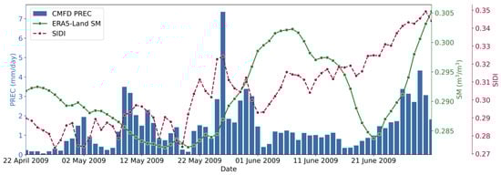 Temporal evolution characteristics of drought processes captured by SIDI in the Xizang Autonomous Region from 22 April to 01 July 2009, against ERA5-Land SM and CMFD PREC.