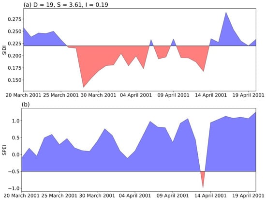 Furthermore, the SIDI and daily SPEI were adopted to identify drought characteristics at the BJ station, a representative station covering the alpine meadow on the central TP based on run theory [] (Figure 8). A short-term drought event lasting 19 days was identified by the SIDI. However, the SPEI cannot identify it. It began on 26 March 2001, and lasted until 13 April 2001 (Figure 8a). The SIDI detected that the drought developed quickly and reached the intensity of extreme drought in several days. Thereafter, the drought eased slowly. Referring to the dry and wet classifications in Table 2, this drought event belonged to a moderate drought (I = 0.19). However, the SPEI shows wet conditions during this period (Figure 8b). The SIDI has a superior ability to identify drought information compared with other traditional indices, such as the SPEI.