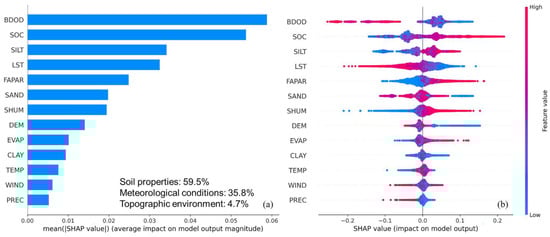 Average SHAP value of every feature (a) and SHAP value of every feature for every sample (b) in the XGBR model. Soil properties include BDOD, SOC, SLIT, SAND and CLAY; meteorological conditions include LST, FAPAR, SHUM, EVAP, TEMP, WIND and PREC; and topographic environment includes DEM.