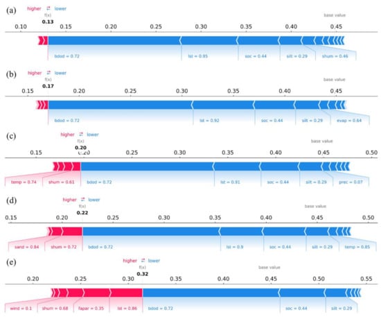 To interpret the interactions among predictor variables toward the model output, the BJ station covered by the representative alpine meadow on the central TP was chosen to apply the SHAP for different drought conditions (Figure 10). Figure 10 is the individual SHAP force plot, which includes three important characteristics: model output , base value (the average of model outputs), and colors. The red color pushes the model output higher, whereas the blue color pushes the model output lower. For extreme and severe drought conditions, bulk density, land surface temperature, and soil organic carbon were the three major contributors to decreasing the model output (Figure 10a,b). In the case of moderate drought, abnormal drought, and nondrought conditions (Figure 10c–e), bulk density and soil organic carbon decreased the model output, while specific humidity slightly increased it. Overall, bulk density (bdod) and soil organic carbon (soc) were two major contributors influencing the model output for all drought conditions, which is consistent with the result in Figure 9b.