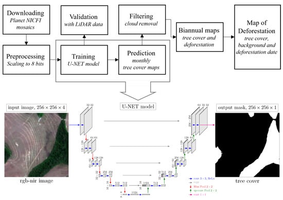 Overall flowchart of the deforestation mapping with planet NICFI and architecture of the U-net model used to produce tree cover masks.