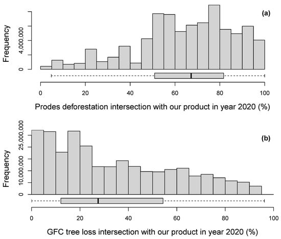 For the year 2020, the histogram of the percentage of intersection per quad for our product and the PRODES deforestation data shows that our product shares consistent information with the PRODES data, as seen in Figure 6a. The median intersection of PRODES with our product was 67.2%, as 75% of the pixels had more than 50.9% of intersection and 25% had more than 81.7%. It is worth noting that the PRODES data are manually made with data at a 20–30 m spatial resolution and do not consider deforested areas below 6.25 ha. This confirms that our deep learning estimations of deforestation overlap well with the deforestation estimates made by human visual interpretation (PRODES). Our product shows less agreement with the GFC “tree loss year” data, as seen in Figure 6b. In 2020, only 25% of our data had an intersection above 54%. An important proportion of the GFC tree loss data of 2020 shows almost no intersection with our product as shown by the median of intersection of 27.5%. Still, for some quads, the intersections can be above 80%, as seen in Figure 6b. This could be linked to other events of tree cover change classified as deforestation by GFC, such as fires, and also to a different definition of tree cover change, which is based on the automatic detection of Landsat pixel reflectance change in GFC.