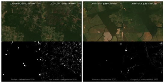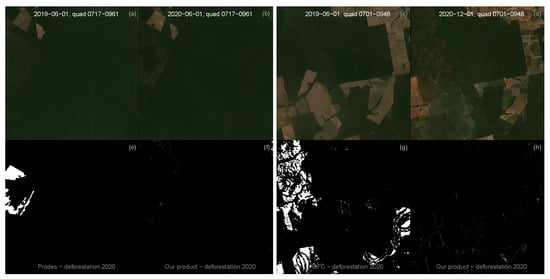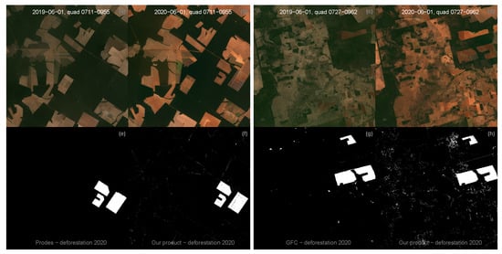 For the tiles with bad agreement between our deforestation mapping and the PRODES or GFC “tree loss year” data, that is, with less than 10% of intersection, as seen in Figure 8, fire mapped as deforestation in PRODES and in GFC’s “tree loss year” data seems to be the culprit, while our algorithm mapped almost no change for the quad 0717-0961 in 2020, as seen in Figure 8a,b,e,f, and a large area of forest that had burned is delineated as deforestation in PRODES, while it is still forest. The same observation is made for the GFC data for the region of the quad 0701-0948 in 2020, as seen in Figure 8c,d,g,h. In this tile, large fires have been mapped as deforestation, while the forest is still there. These fires included in the mapping of deforestation in PRODES or GFC “tree loss year” data leads to a major discrepancy with our product.