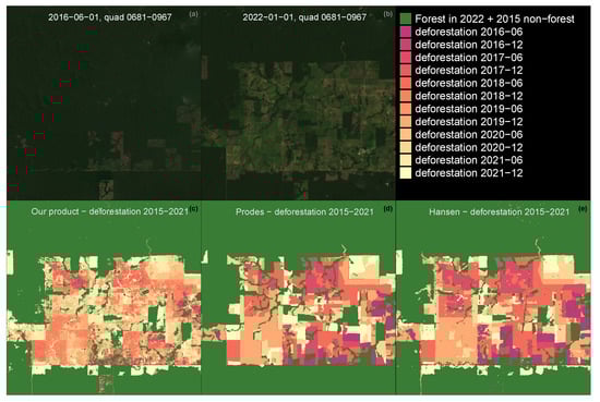 Example of our deforestation product for planet quads in the Xingu region (a,b), in a recent deforestation front between the Mato Grosso and Amazonas states (c,d) and in the South Central region of Mato Grosso (e) on the period from 1 December 2015 to 1 December 2021.