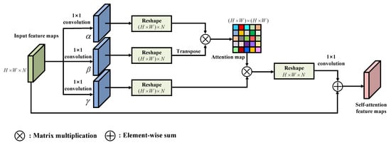 where , , , and N indicate the channel of reshaped feature map. Then, , , and are reshaped to . To obtain the spatial self-attention map , the matrix multiplication is applied between and the transpose of with the softmax function: