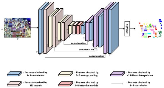 As shown in Figure 3, the HA-EDNet is comprised of two basic subnetworks: (1) the encoder subnetwork and (2) the decoder subnetwork. As input, the coherence matrices of the whole PolSAR image are employed. Then, the encoder subnetwork is used to compute the hierarchical convolutional feature maps of the input PolSAR image, which is started with a 3 × 3 convolutional layer, a BN layer, and a ReLU function. The remaining part is composed of three SK modules and three downsampling layers. Here, 2 × 2 average pooling layers are utilized as the downsampling layers. In the top layer of the encoder subnetwork, the self-attention module is used to build long-range dependency. The decoder subnetwork is used to recover the spatial dimension of the coarsest convolutional feature map, which is a sample composed of three 3 × 3 convolutional layers and three upsample layers. Here, the upsampling layer is the bilinear interpolate function with a factor of 2. To effectively combine the spatial detail features in the encoder subnetwork and the semantic features in the decoder subnetwork, the feature maps of every SK module are added to the same size output of the decoder subnetwork. Finally, the softmax function is utilized to classify.
