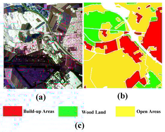 Figure 6. The pseudocolor image (a), the ground truth (b), and legends of classes (c) for Oberpfaffenhofen dataset. - (4)