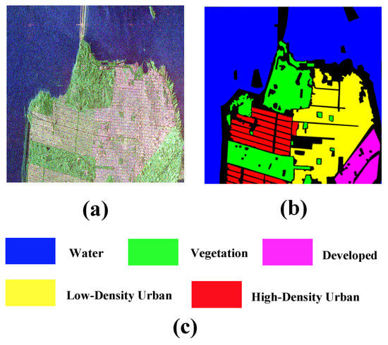 - San Francisco dataset: The San Francisco dataset is obtained from the C-band RADARSAT-2, which covered San Francisco in 2008. The pseudocolor image, the ground truth, and legends of classes are shown in Figure 7. The ground truth of the dataset includes five types of objects.