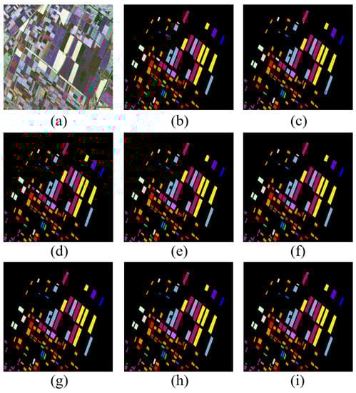 Results of the Flevoland-15 dataset: (a) pseudocolor image; (b) ground truth; (c) CNN; (d) 3D-CNN; (e) MS-CNN; (f) CV-CNN; (g) FCN; (h) U-Net; (i) proposed method.