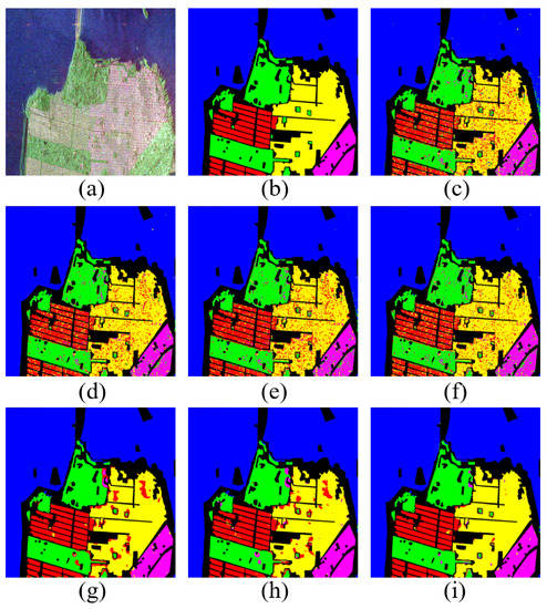 Results of the San Francisco dataset: (a) pseudocolor image; (b) ground truth; (c) CNN; (d) 3D-CNN; (e) MS-CNN; (f) CV-CNN; (g) FCN; (h) U-Net; (i) proposed method.