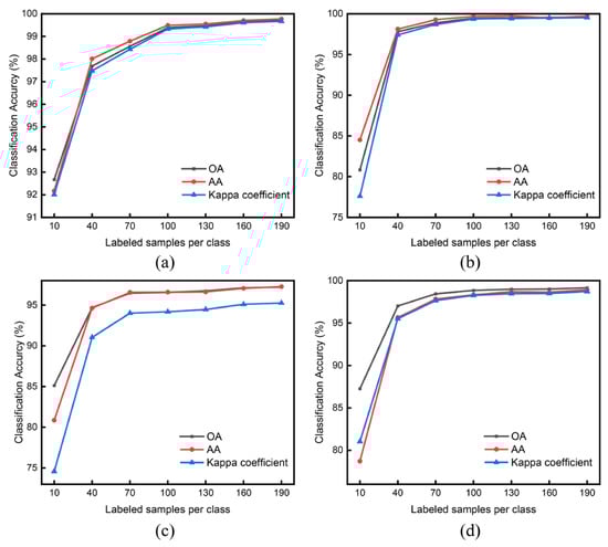 Classification accuracy changes with the number of training samples: (a) Flevoland-15 dataset; (b) Flevoland-14 dataset; (c) Oberpfaffenhofen dataset; (d) San Francisco dataset.