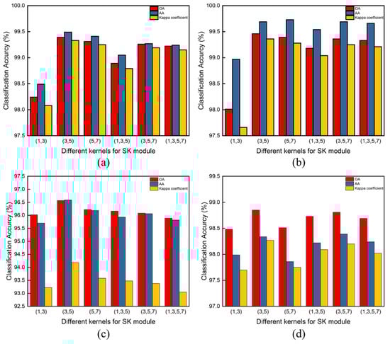 In the proposed method, the main parameter that affects the model performance is the kernel number of SK modules. The kernel size determines the range of the receptive field that is used to extract features. We verify the model performance when the kernel groups are (1, 3), (3, 5), (5, 7), (1, 3, 5), (3, 5, 7), and (1, 3, 5, 7). In Table 11 and Figure 13, the classification results show that using 3 × 3, 5 × 5, and 7 × 7 kernels can achieve better classification performance. When the kernel group is (3, 5), the model obtains the best classification accuracies. It demonstrates that 3 × 3 and 5 × 5 kernel groups are beneficial for capturing multi-scale features and significantly improve the classification performance.