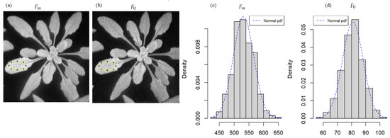 We consider chlorophyll fluorescence imaging on rosettes of Arabidopsis thaliana ecotype Col0. The experiment consisted of 36 pots of four plants each. Half of the pots were inoculated with water, and the other half with the virulent DC300, a tomato bacteria. We attribute ‘Healthy’ to the pots inoculated with water and ‘Diseased’ to the ones with the bacteria. Chlorophyll fluorescence imaging was realized during six days of the experiment: D0, D2, D5, D6, D7, and D8. The same data set was used for automated disease segmentation [13,27]. A full description of the experiment is in these two papers. We got interested in , the fluorescence after saturating actinic flash, and , the basal fluorescence before the flash. To build a statistical model of and we manually selected areas located in the limb of the leaves as illustrated in Figure 1. The physical interpretation of the distribution observed is the thermal noise of the camera, which is expected to be Gaussian with an additive coupling.