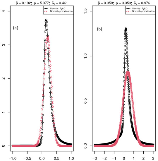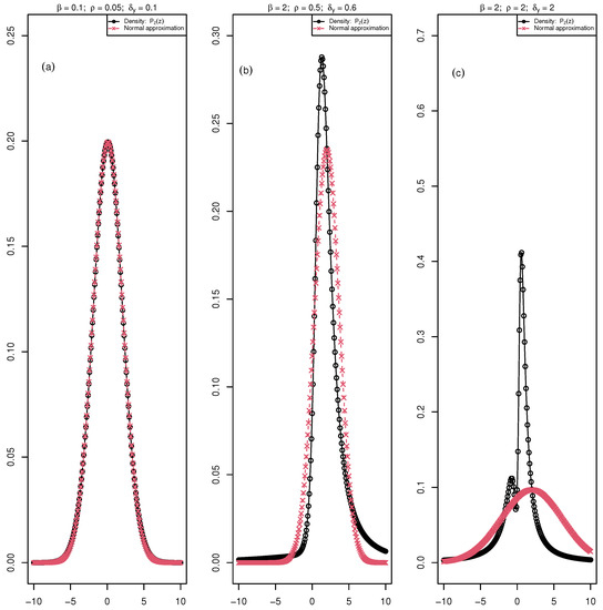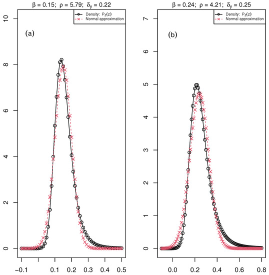 An approximation of the distribution of Z by a normal distribution has been proposed by [34]. Most authors defined conditions on the parameters, , and resulting from empirical or simulation works and showed the switch from a normal distribution to a bimodal distribution under certain values [36,37,38]. This is illustrated with simulation for different values of , and in Figure 2. We draw the distribution of the ratio for three different values of the parameters and we add the normal approximation proposed by [34].